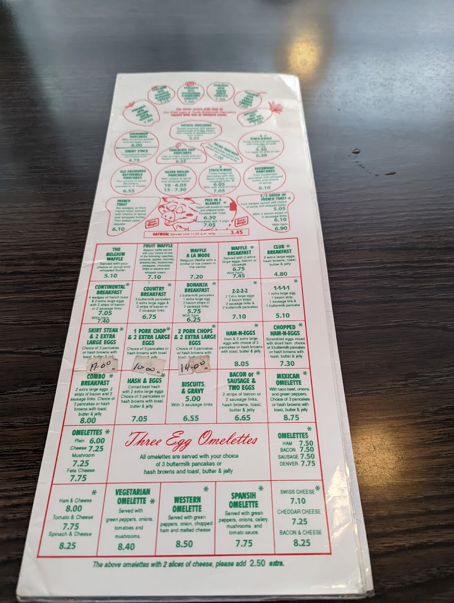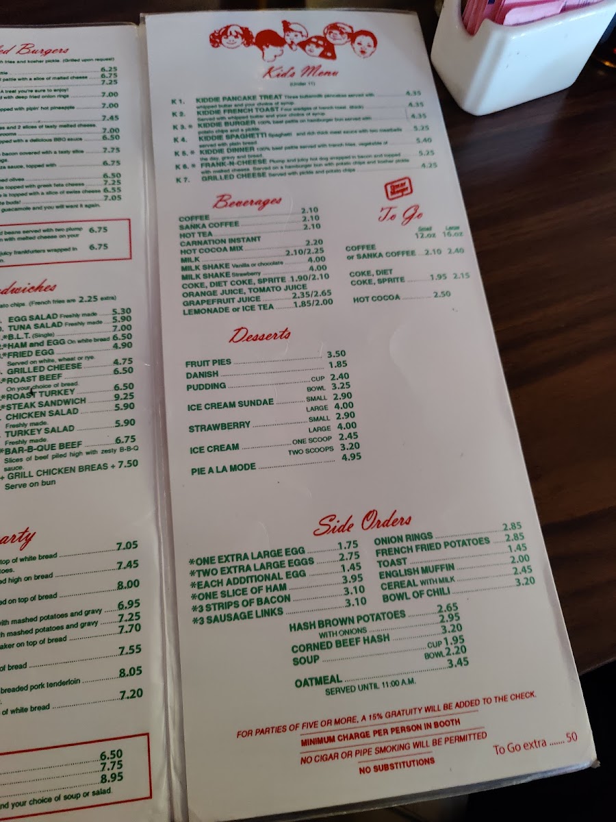 The menu features an inviting range of options, from fluffy pancakes—like blueberry or chocolate chip—to savory plates such as steak and eggs or the Mexican omelette with a side of pancakes. Hash browns, biscuits and gravy, and various melt sandwiches provide satisfying choices throughout the day, while crisp onion rings and fries make for easy sides. The drinks menu keeps it simple with black coffee and classic diner beverages, fitting seamlessly with the relaxed, vintage atmosphere of the place.